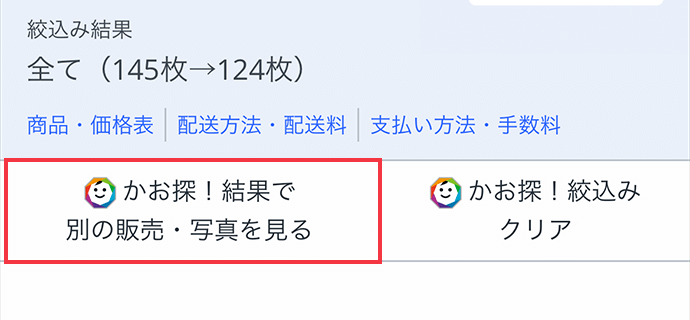 かお探!結果で別の販売・写真を見る」を押すと、絞込み状態のまま同時購入可能な他の販売や写真グループを閲覧できます。