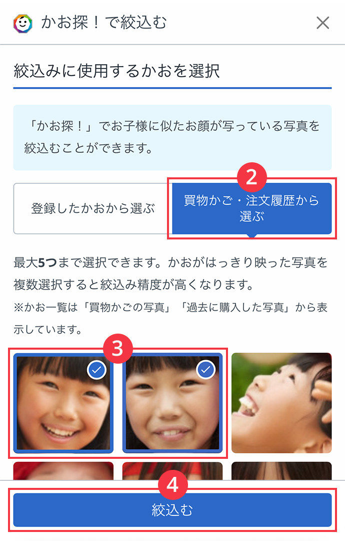 - 買物かごの写真・過去に購入した写真に写っているかおが一覧に表示されますので、絞込みに使用したいかおを最大5つまで選択します。